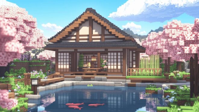 La maison traditionnelle japonaise dans Minecraft s'inspire directement de l'architecture authentique nippone. Cette création combine la simplicité des formes avec une utilisation réfléchie des blocs pour maintenir des performances optimales dans le jeu.